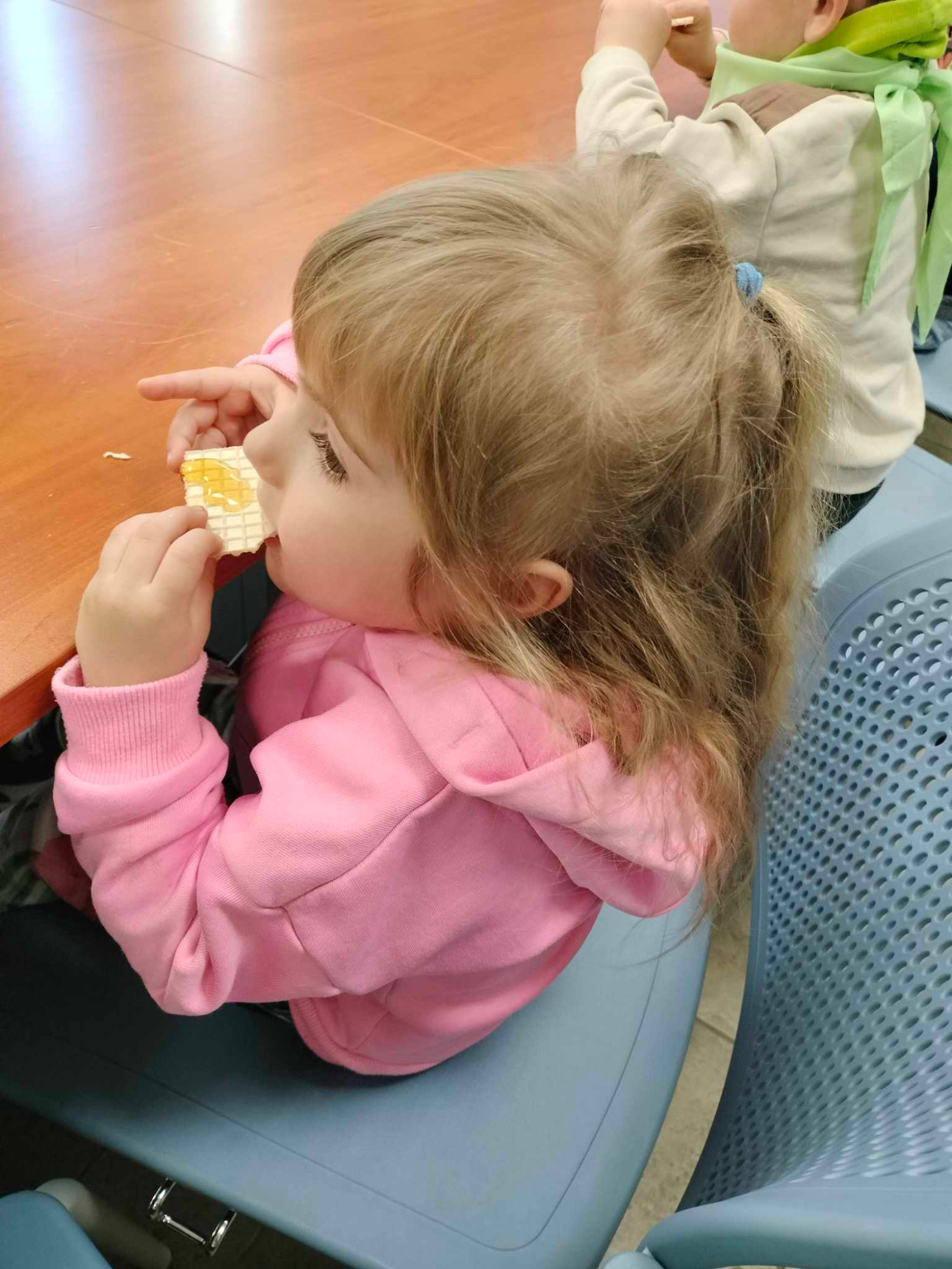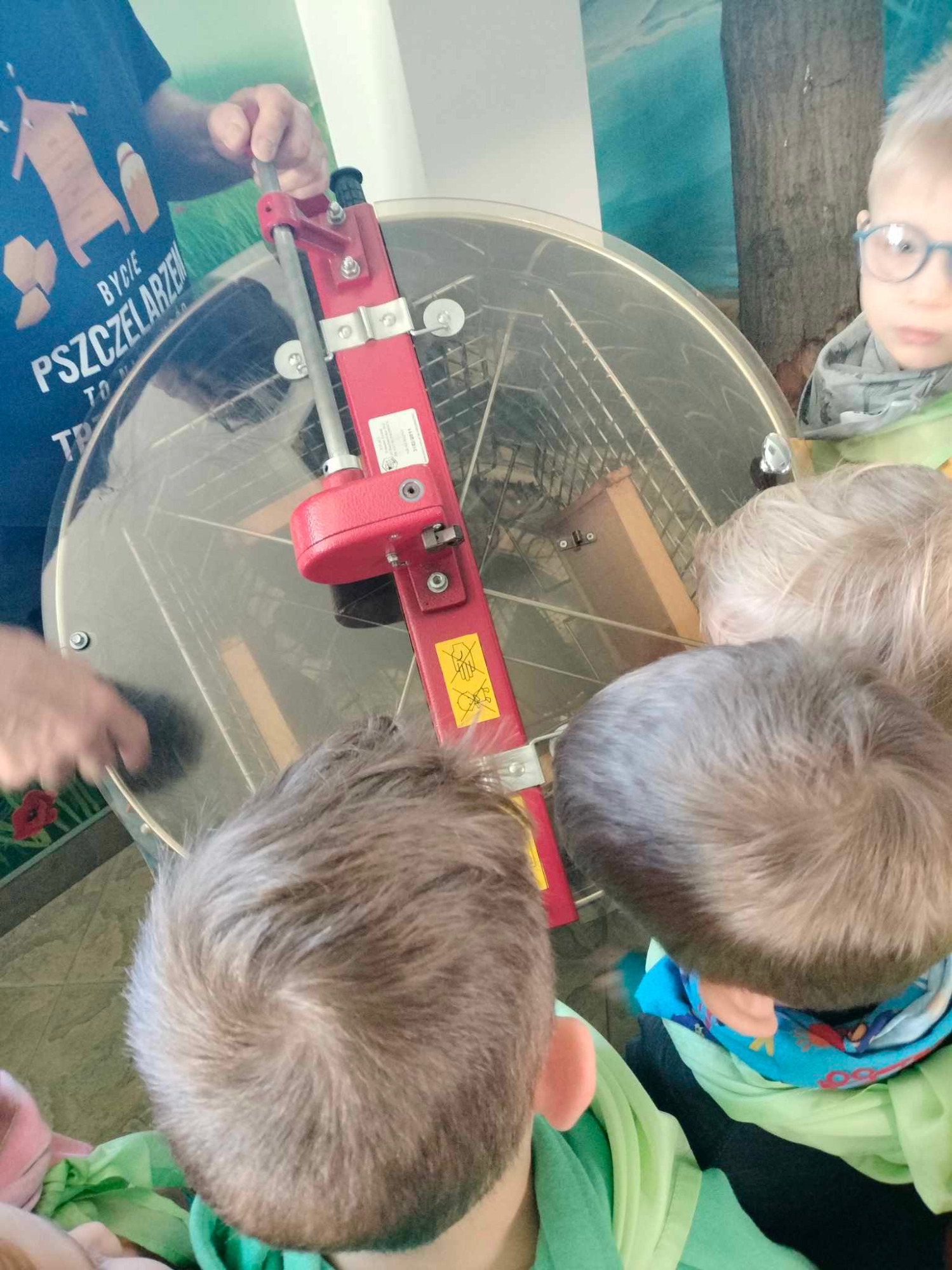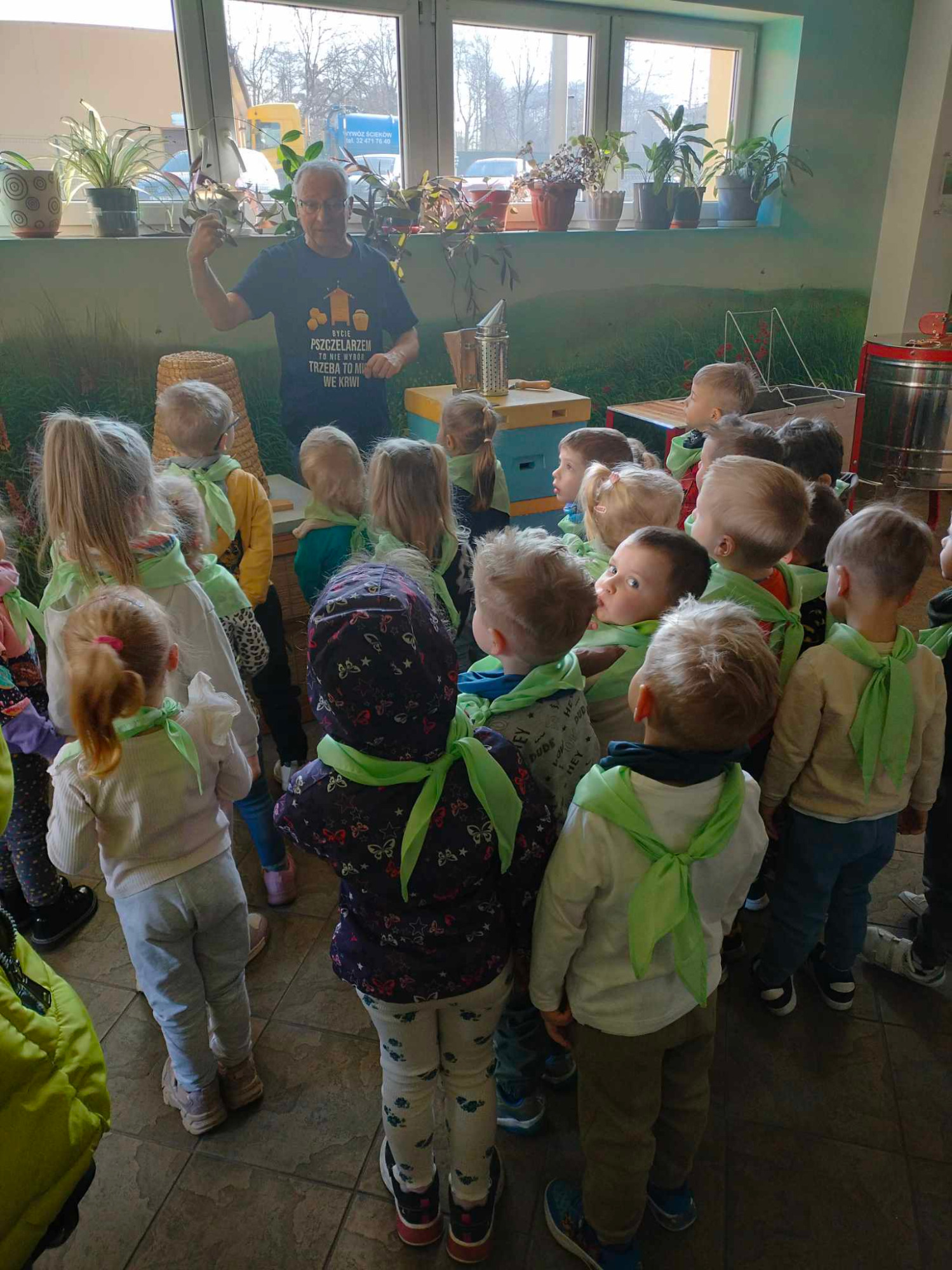 Poczas wycieczki Skrzaty czestniczyły w wyjątkowym spotkaniu. Przedszkolaki miały możliwość poznać życie pszczół oraz produkcję miodu. Swą wiedzą podzielił się Pan pszczelarz, który zapoznał dzieci z wieloma atrybutami potrzebnymi do zbioru miodu. Przedszkolaki poznały wiele ciekawostek z życia pszczół, ich fascynujący świat. Dzieci poznały etapy rozwoju pszczoły, dowiedziały się, jaką rolę w ulu pełni królowa, robotnice, kim jest truteń…, jak i gdzie pszczoły przenoszą pyłek kwiatowy oraz jak powstaje miód. Przedszkolaki miały możliwość zobaczenia niektórych narzędzi niezbędnych w pracy pszczelarza, chętne dzieci mogły nawet wcielić się w jego rolę przymierzając ubranie zakładane przed wejściem do pasieki.