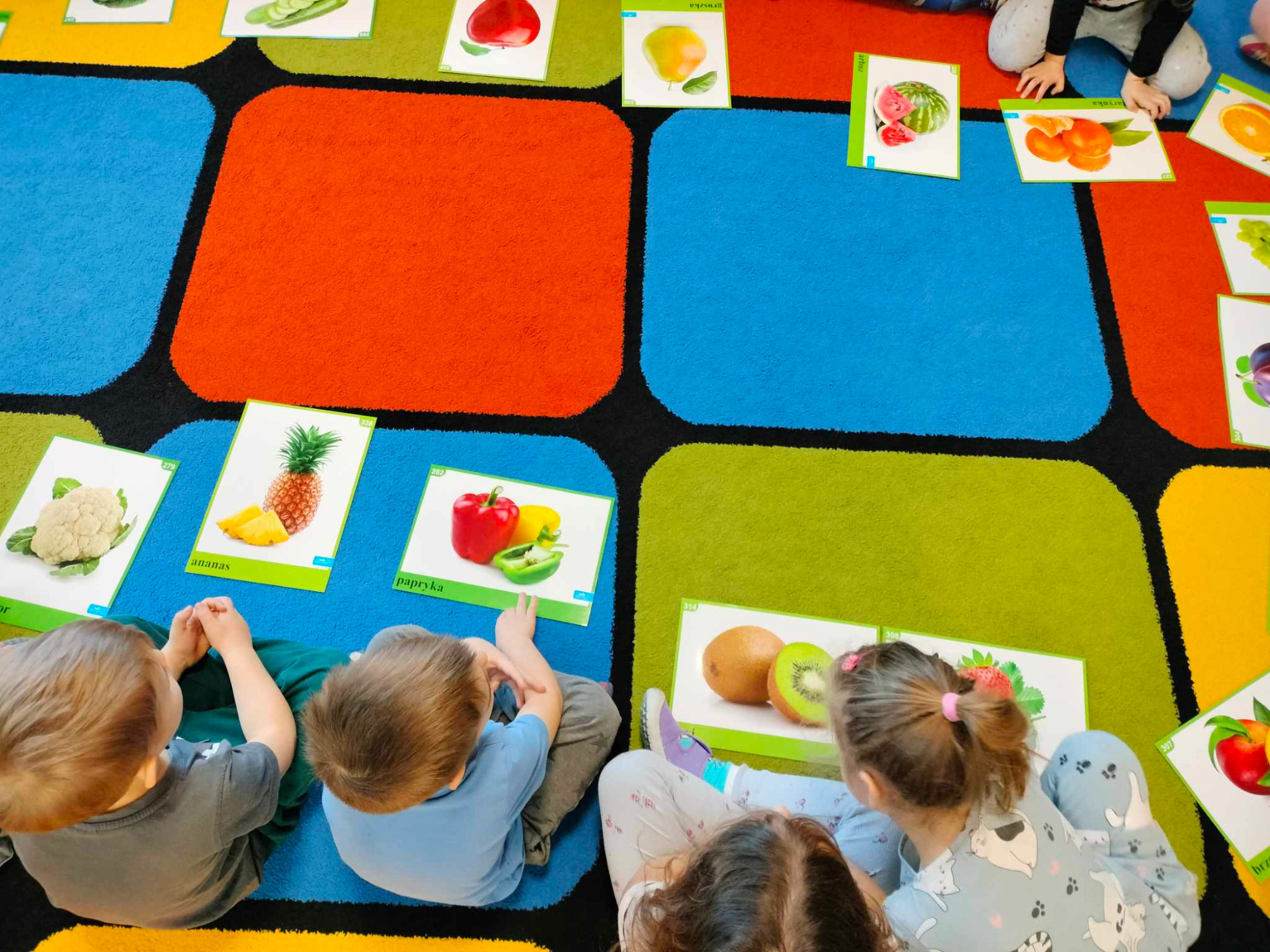 Następnie przypomnieliśmy sobie nazwy owoców i warzyw, omawiając każde z nich. Dzieci pięknie dzieliły nazwy warzyw i owoców na sylaby i głoski.