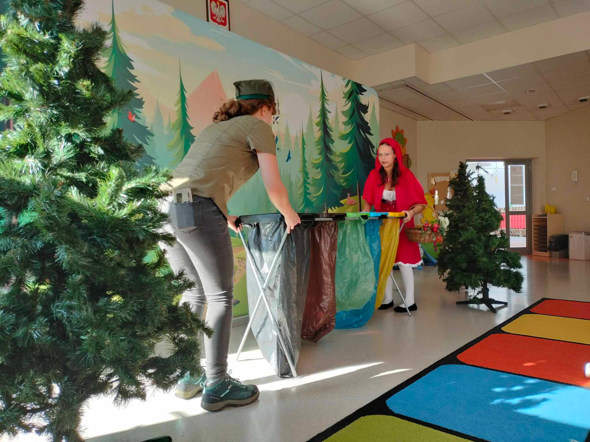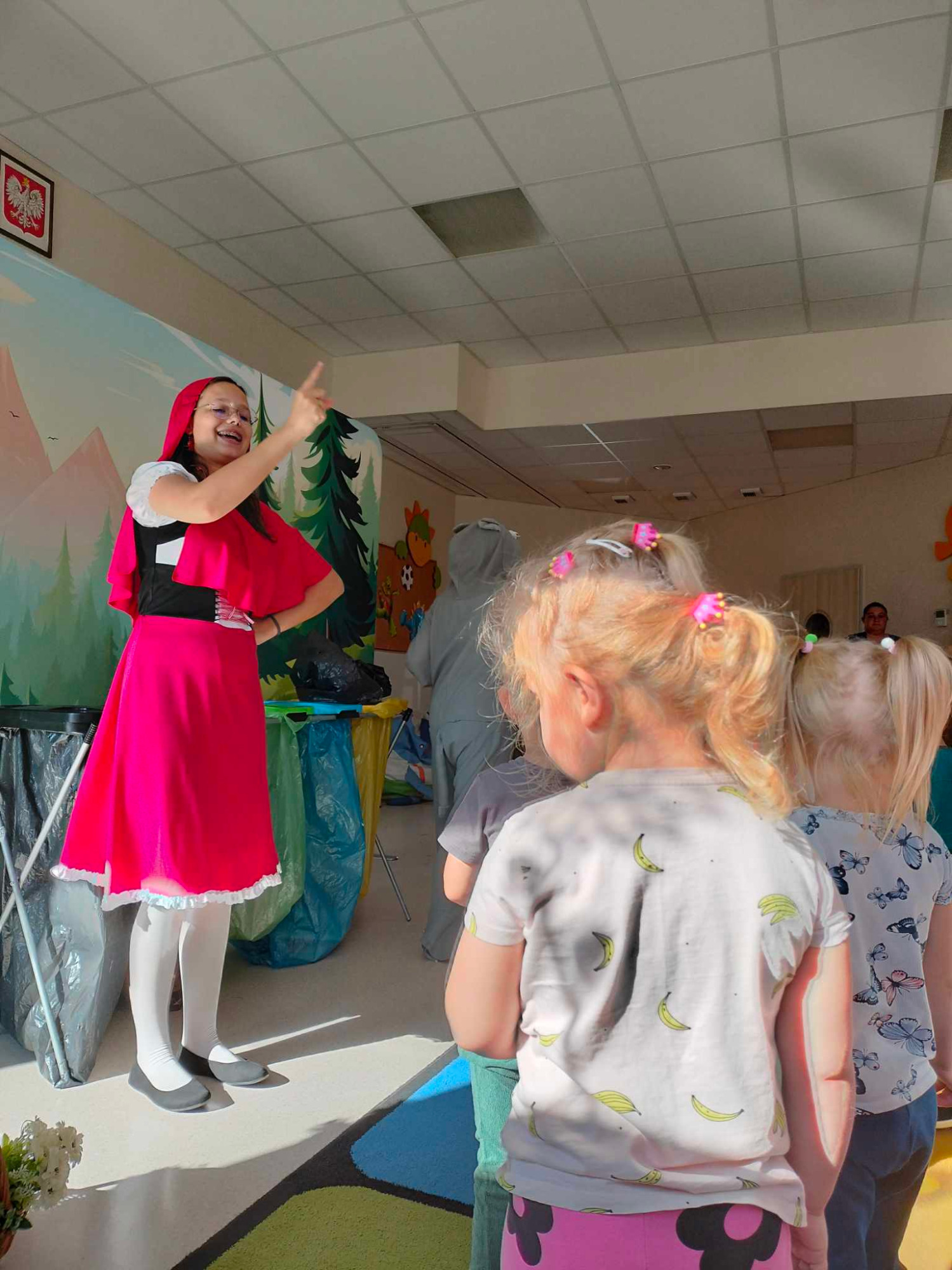 Dzieci z grupy Leśne Skrzaty uczestniczyły w przedstawieniu pt. " Dobre rady na złe odpady- czyli ekologiczny Czerwony Kapturek."Spektakl miał na celu propagowanie wśród dzieci właściwych nawyków związanych z ekologią. Dla większości naszych najmłodszych przedszkolaków było to pierwsze w życiu przedstawienie, które z ciekawością i skupieniem oglądały. Dzieci miały okazję podjąć się trudnego zadania segregacji śmieci wraz z Czerwonym Kapturkiem, Wilkiem oraz Panem Gajowym które wykonały na medal !