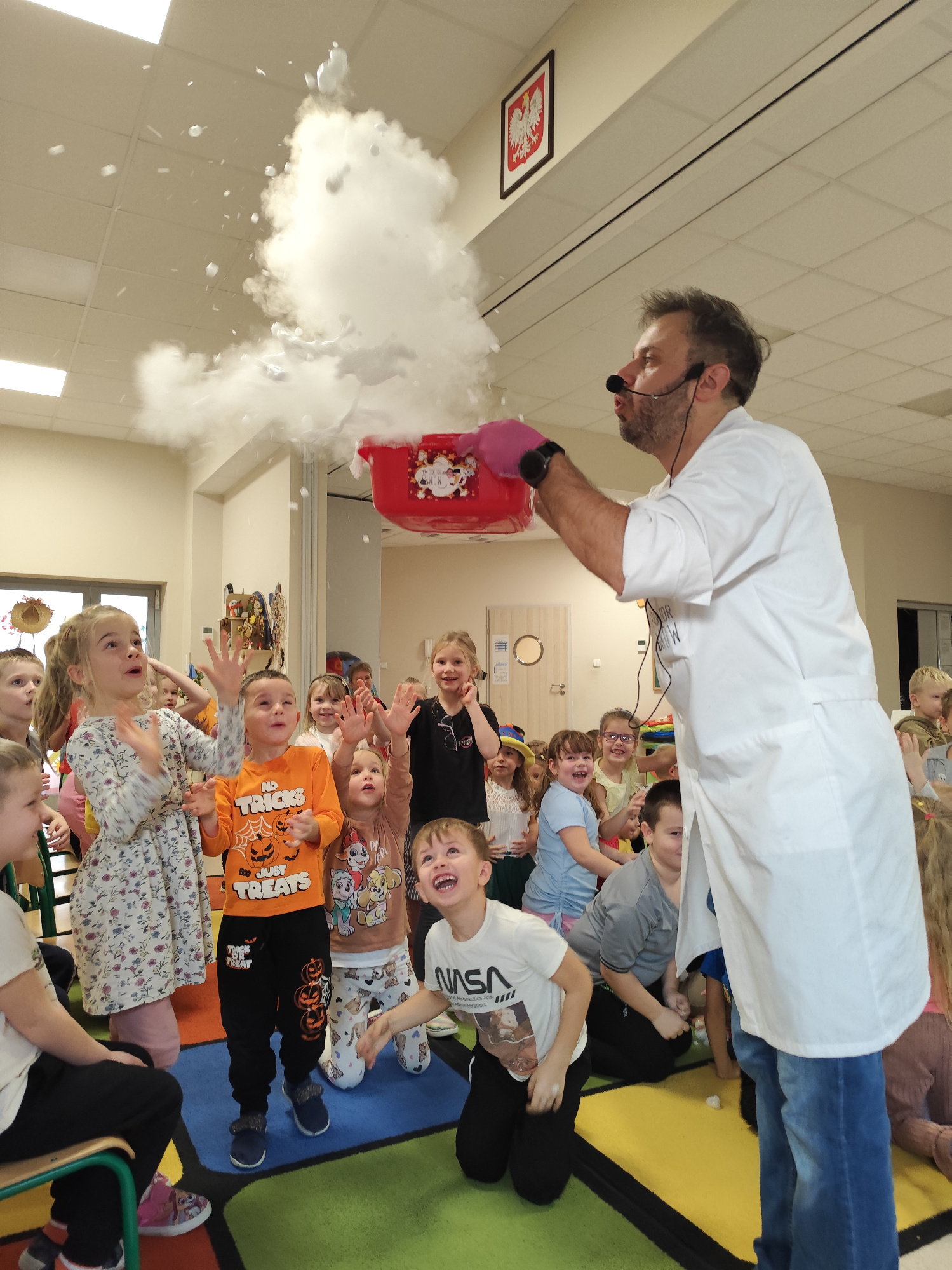 Dzieci były zachwycone każdym eksperymentem i cały czas było im mało. Pełne wrażeń i zdobytych doświadczeń z uśmiechem pożegnali Pana dr.WOW. Odkrywanie przez doświadczanie to coś co Bystre Smyki uwielbiają