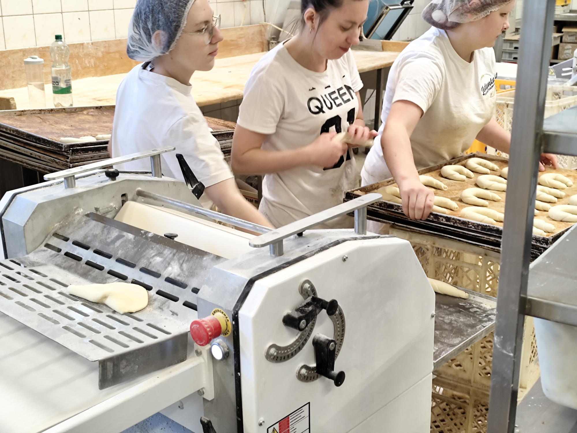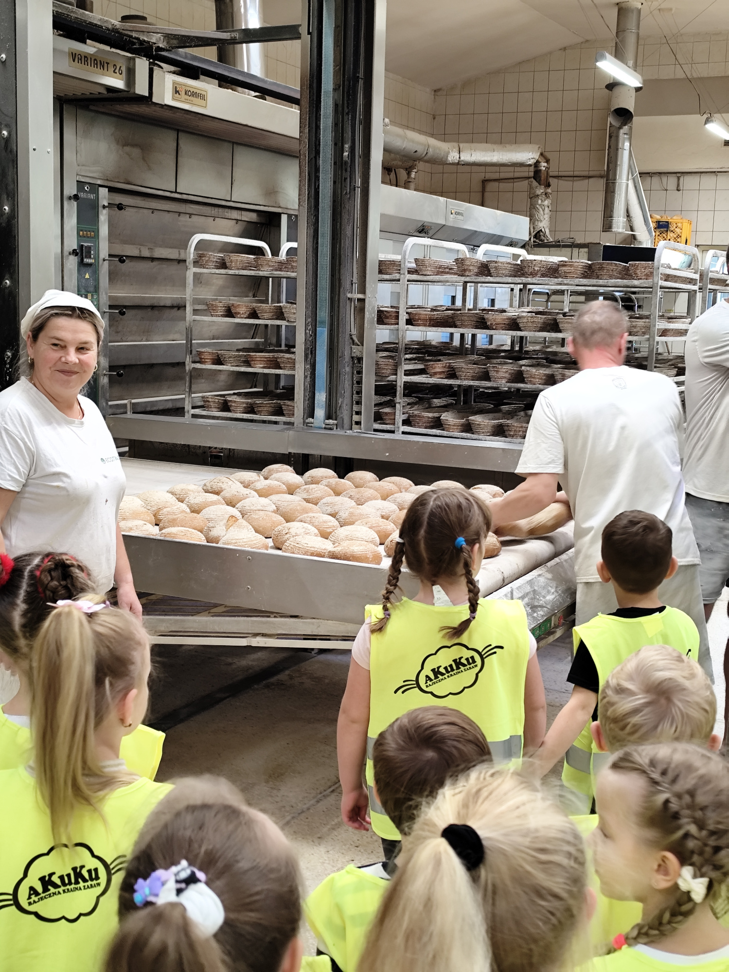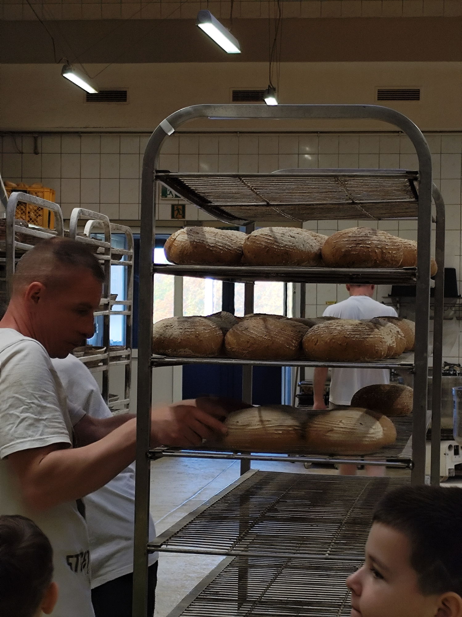 Na początku weszliśmy do pomieszczenia, w którym znajdowały się maszyny do wyrobu ciasta chlebowego. Pracownicy piekarni dokładnie opowiedzieli nam, do czego służą poszczególne urządzenia. Mogliśmy też zapoznać się z kolejnymi etapami wypieku chleba. Obserwowaliśmy, jak w ogromnej elektrycznej dzieży mieszano składniki na chleb. Następnie ciasto trafiło do specjalnej maszyny porcjującej. Gotowe, ukształtowane bochenki pracownicy w białych ubraniach wkładali do obsypanych mąką foremek, które następnie ustawiali na specjalnym ,,piętrowym” wózku. Mieliśmy również możliwość obserwowania powstawania rogali oraz babki cytrynowej i bez.