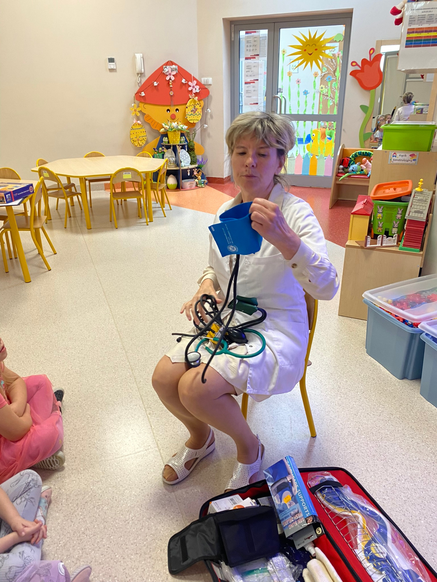 W trakcie spotkania pani Higienistka pokazała dzieciom różne przybory, których używa w swojej pracy, takie jak: rękawice ochronne, termometry, bandaże oraz inne akcesoria medyczne. Dzieci mogły obejrzeć je z bliska i dowiedzieć się, do czego służą.