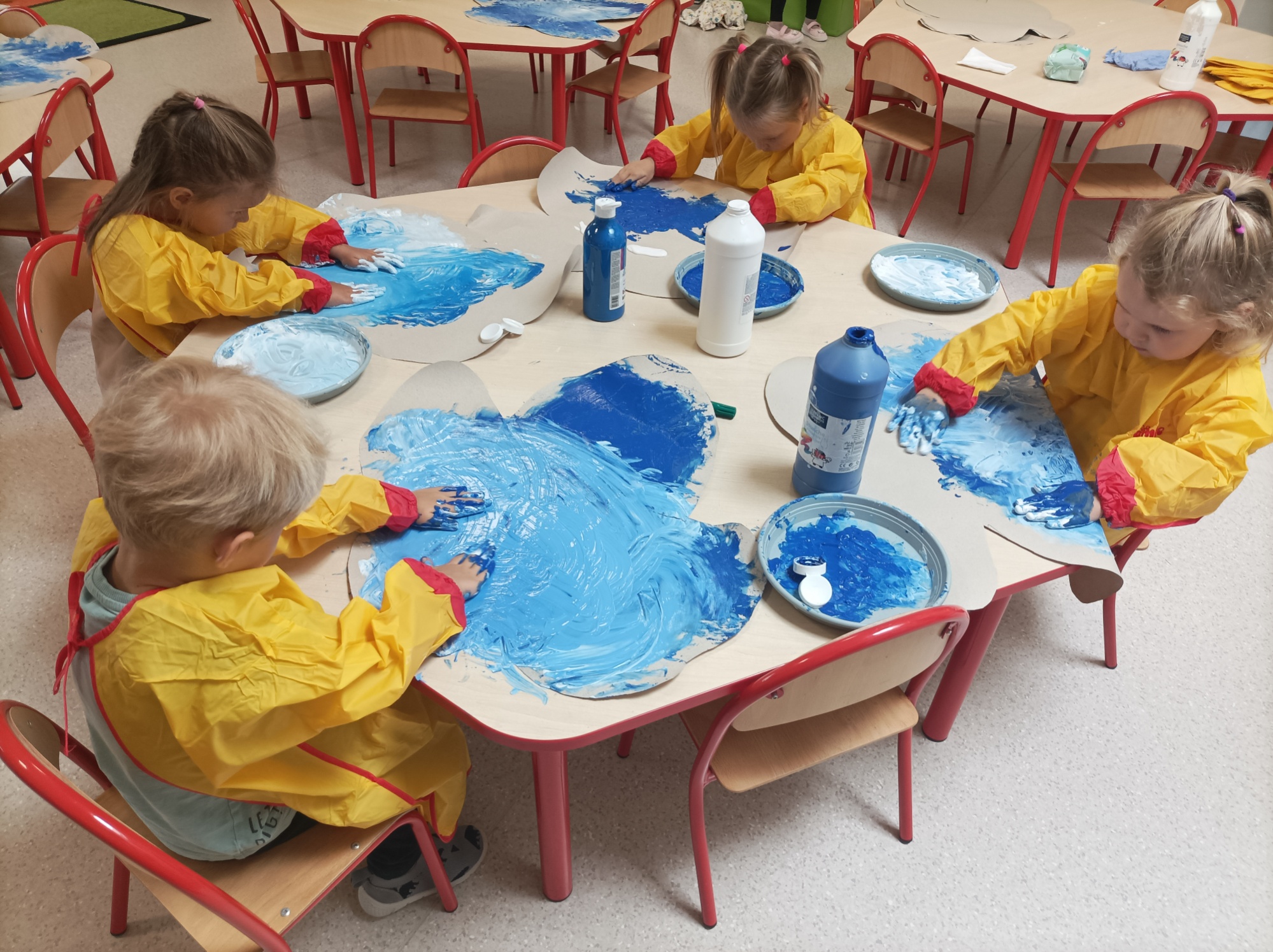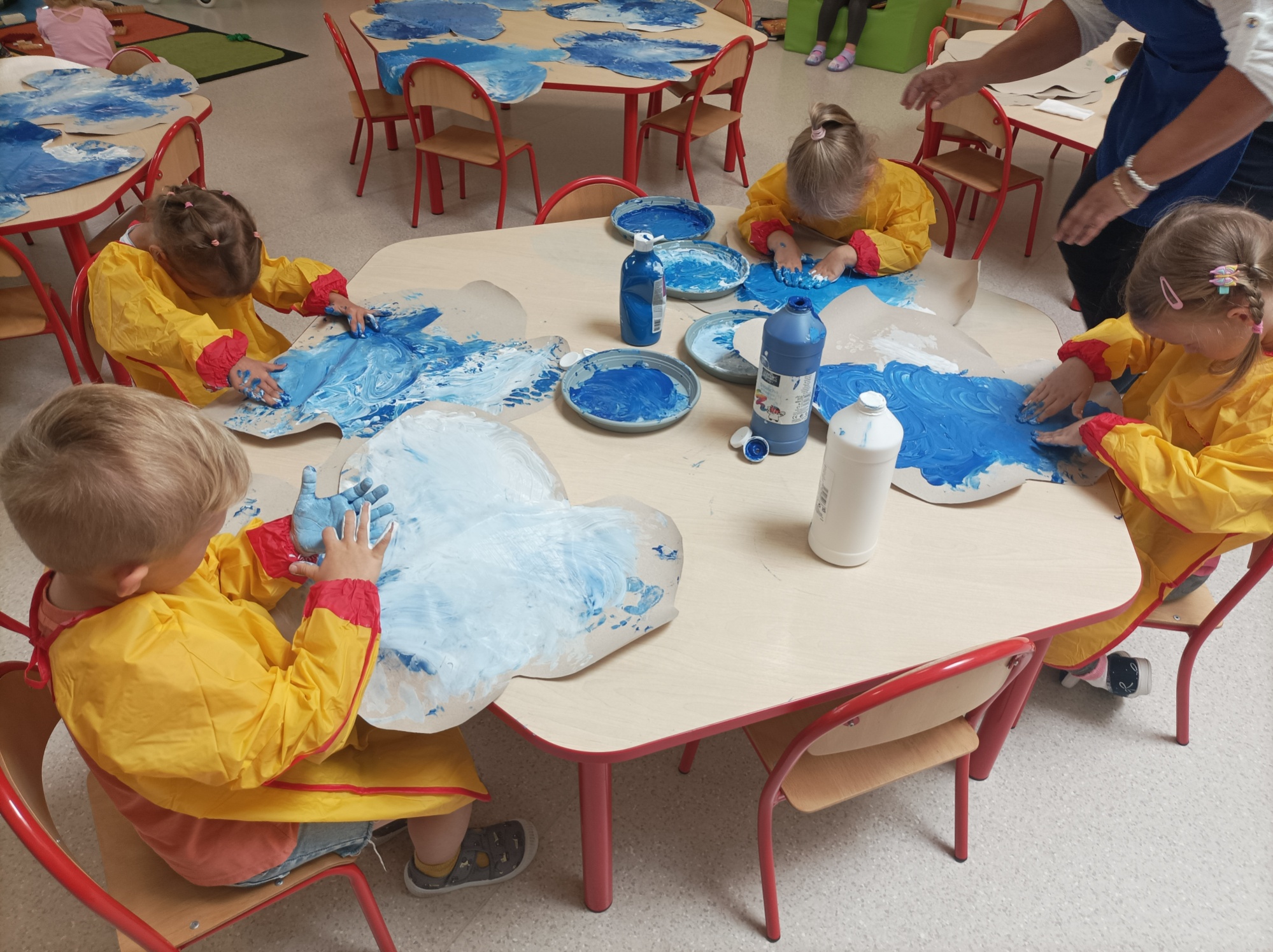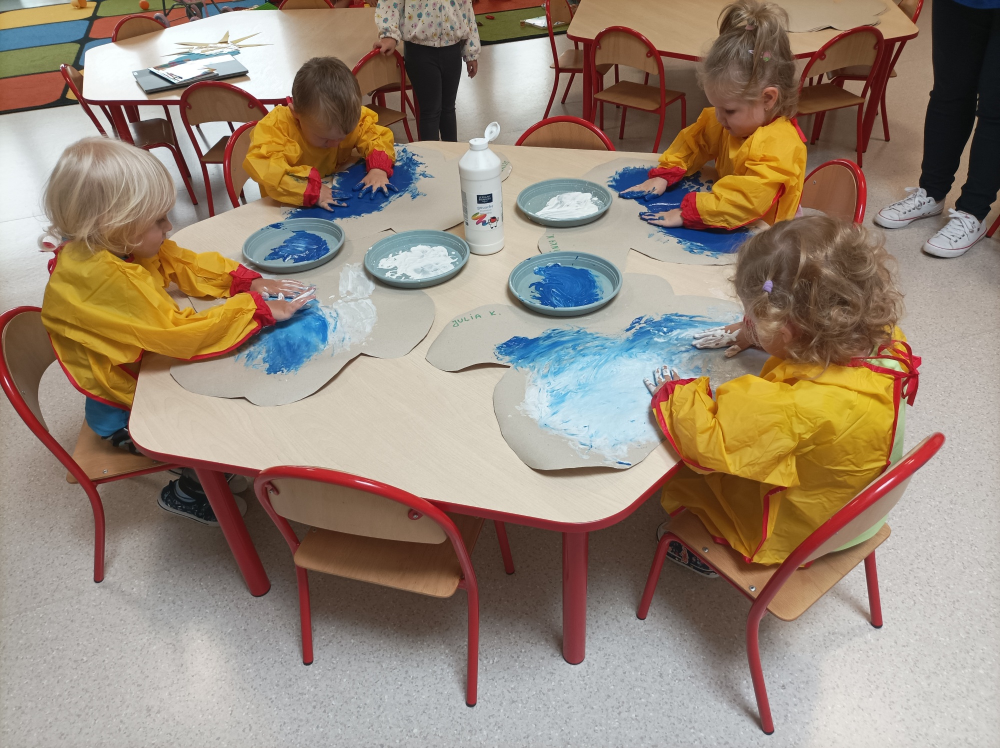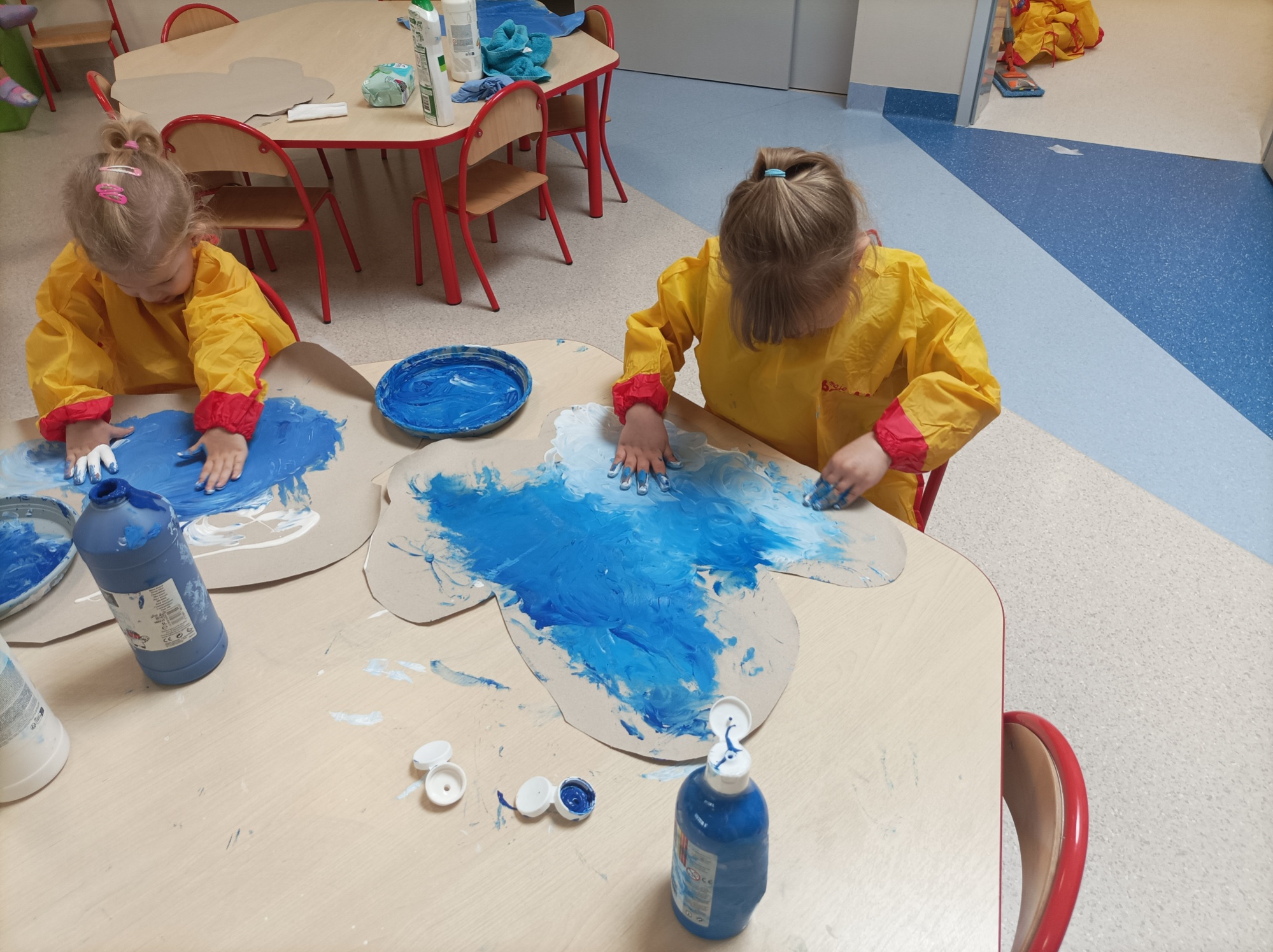 Dziś dzieci mogły bez ograniczeń się ubrudzić, ćwiczyliśmy małą i dużą motorykę. Efektem ich pracy były przepiękne chmurki, które ozdabiają nasza gazetkę.